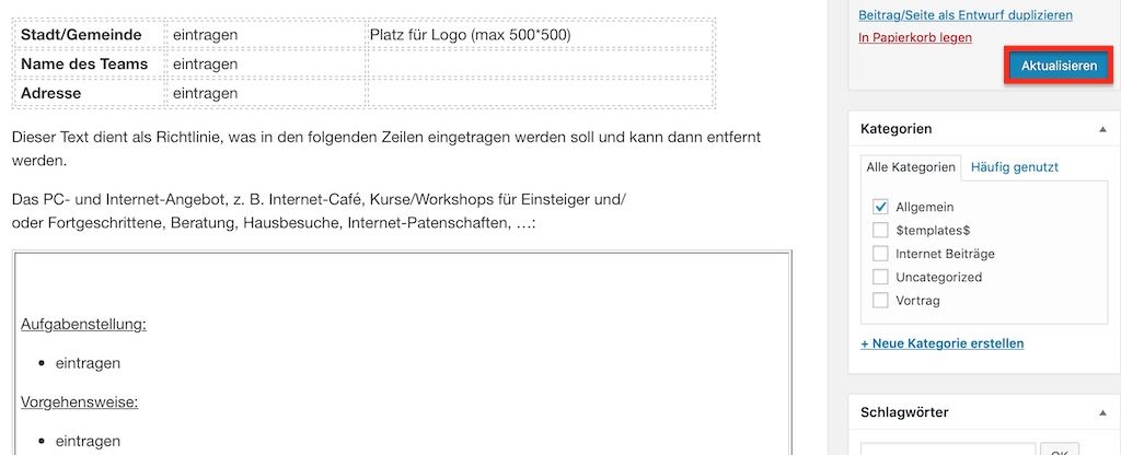 - Nach Abschluss der Eingabe die Änderungen mit einem Klick auf den Button “Aktualisieren” speichern und veröffentlichen. Die Änderungen sollten jetzt für alle sichtbar sein. Eventuell muss der Cache des Browsers noch mit der Taste F5 aktualisiert werden.