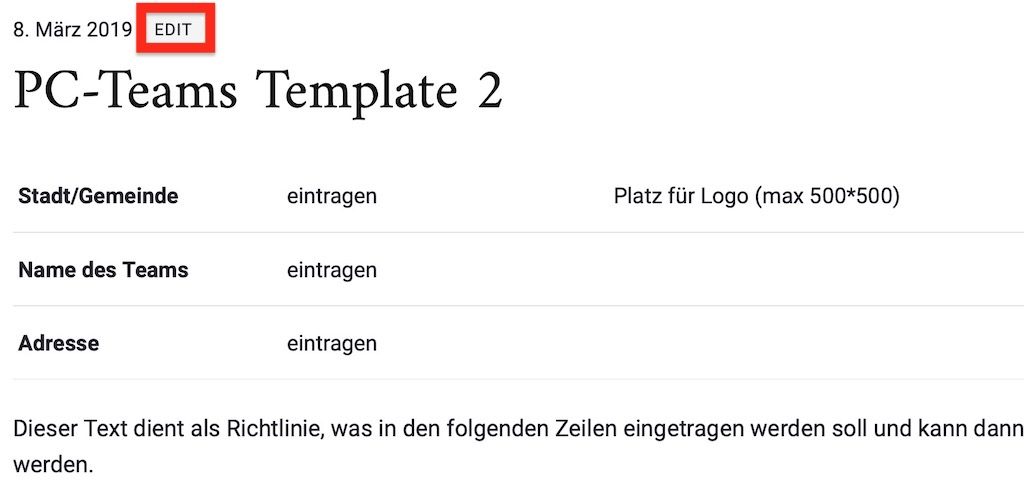 - Beim geöffneten Template mit einem Klick auf “Edit” in den Editmodus gehen